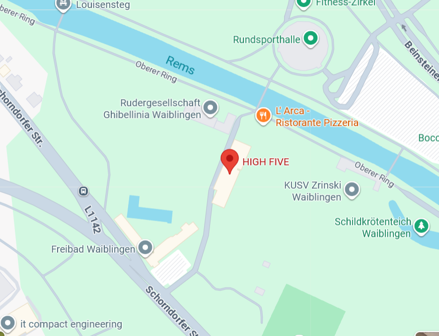 Parkplätze befinden sich an der Rundsporthalle. Über die Brücke gelangst Du direkt zum High Five.